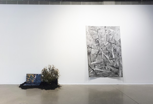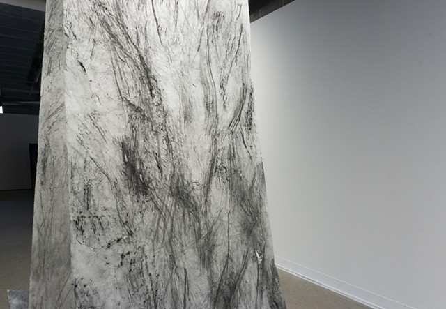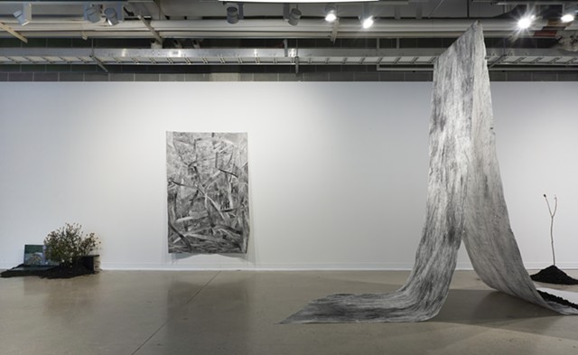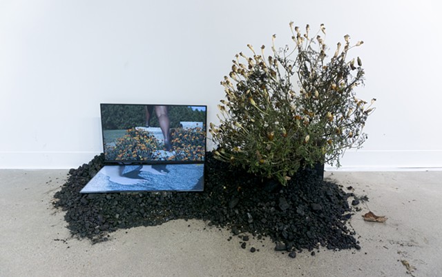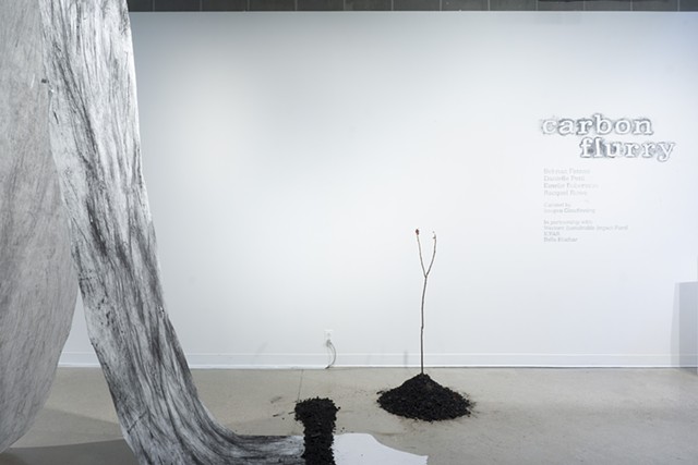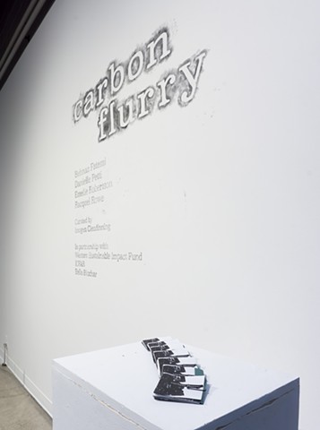 In Carbon Flurry, artists Danielle Petti, Racquel Rowe, Emelie Robertson and Behnaz Fatemi conduct new creative interventions and experimentation as they animate the engineered material biochar. Created using a process of pyrolysis--a chemical decomposition of matter through heat--biochar is a material remnant of waste management technologies that seek to mitigate climate change, by capturing carbon and storing it in soil for hundreds or thousands of years. In Carbon Flurry, the artists respond to the agency of biochar, allowing the material to take on new layers of meaning beyond its utility as the biproduct of waste. Petti, Rowe, Robertson and Fatemi emphasize the affectual and tactile qualities of its form, as well as the potentiality of biochar as matter; how it abstracts geologic time, fossilizing abundant carbon-emitting chemicals and holding them in stasis.